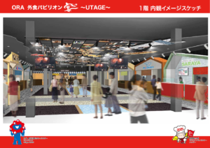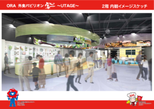 ORA(大阪外食産業協会)が、2025年大阪・関⻄万博に⺠間パビリオンとして出店をする「ORA外食パビリオン〜宴〜」について、食の提供(販売)を行う1階部分の内観が固まってきましたので公開させていただきます。