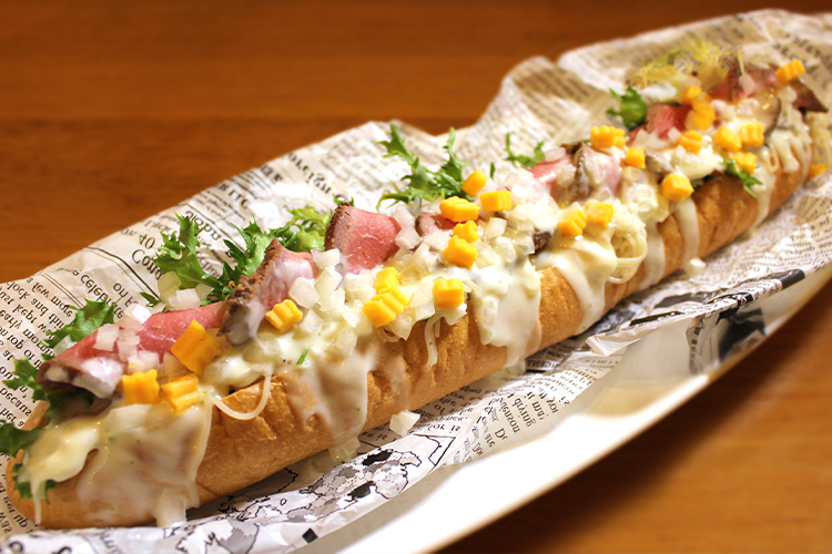 - パンと米(米粉入り麺)が出会った♪ローストビーフにワサビソース!万博限定ドッグです