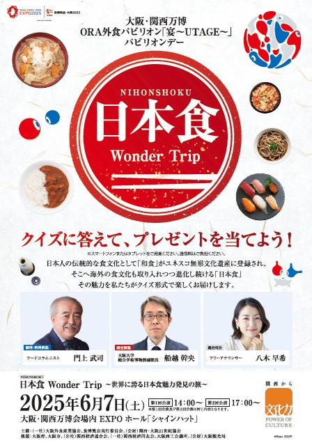 大阪外食産業協会では、万博会期中の6月7日(土)に万博会場内のイベントスペース「EXPOホール」にてパビリオンデーイベントとして、日本食Wonder Trip ~世界に誇る日本食魅力発見の旅~を開催いたします。