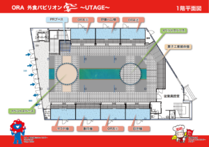 1 階フロアは、食を提供・販売するエリア、PR するイベントエリアで構成されています。